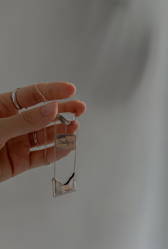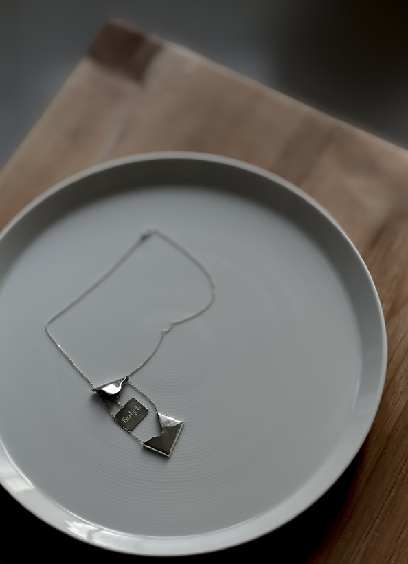 از وقتی که برای طرحش تصمیم میگیریم تا وقتی که آماده میشه، هر مرحله رو با دقت و عشق جلو میبریم. ساخت گردنبند پاکت حدود ۵ ساعت زمان برده و همه کارهاش (به جز قسمت حک کردن) با دست انجام شده.